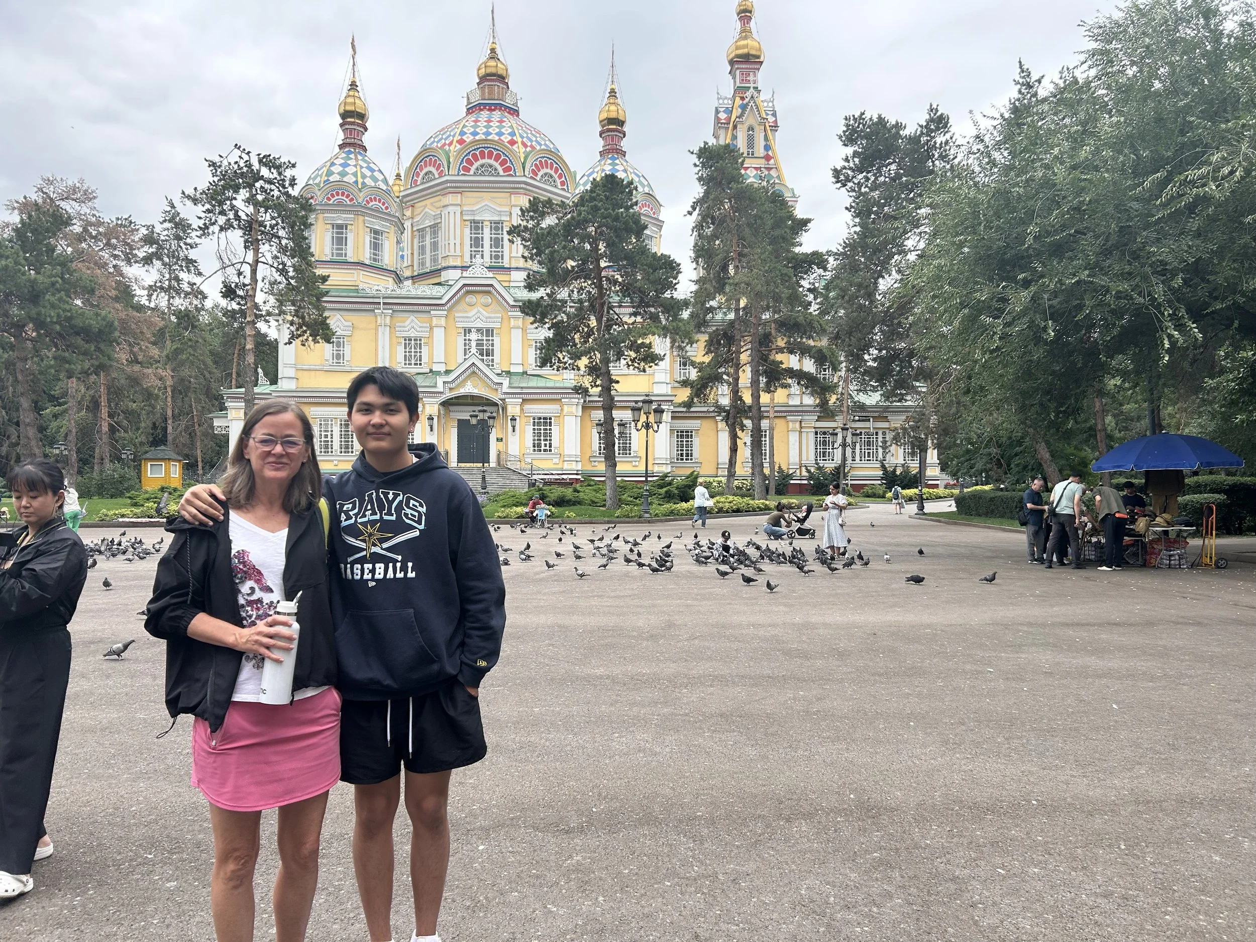 Amelia and Noah pose in front of Zenkov Orthodox Church in Almaty.